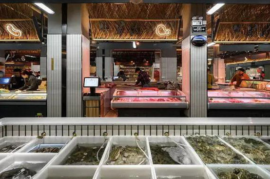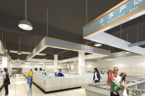 冰鲜区: 冰鲜水产品交易区柜台宜设置在靠墙侧,布局相对集中内墙面铺设瓷砖宜到顶,地面铺设防滑地砖,应有一定的排水坡度台面采用不锈钢结构或砖砼结构,台面上加装多孔不锈钢板,外贴瓷砖,冰鮮经营摊位还应配置保鲜冷柜。